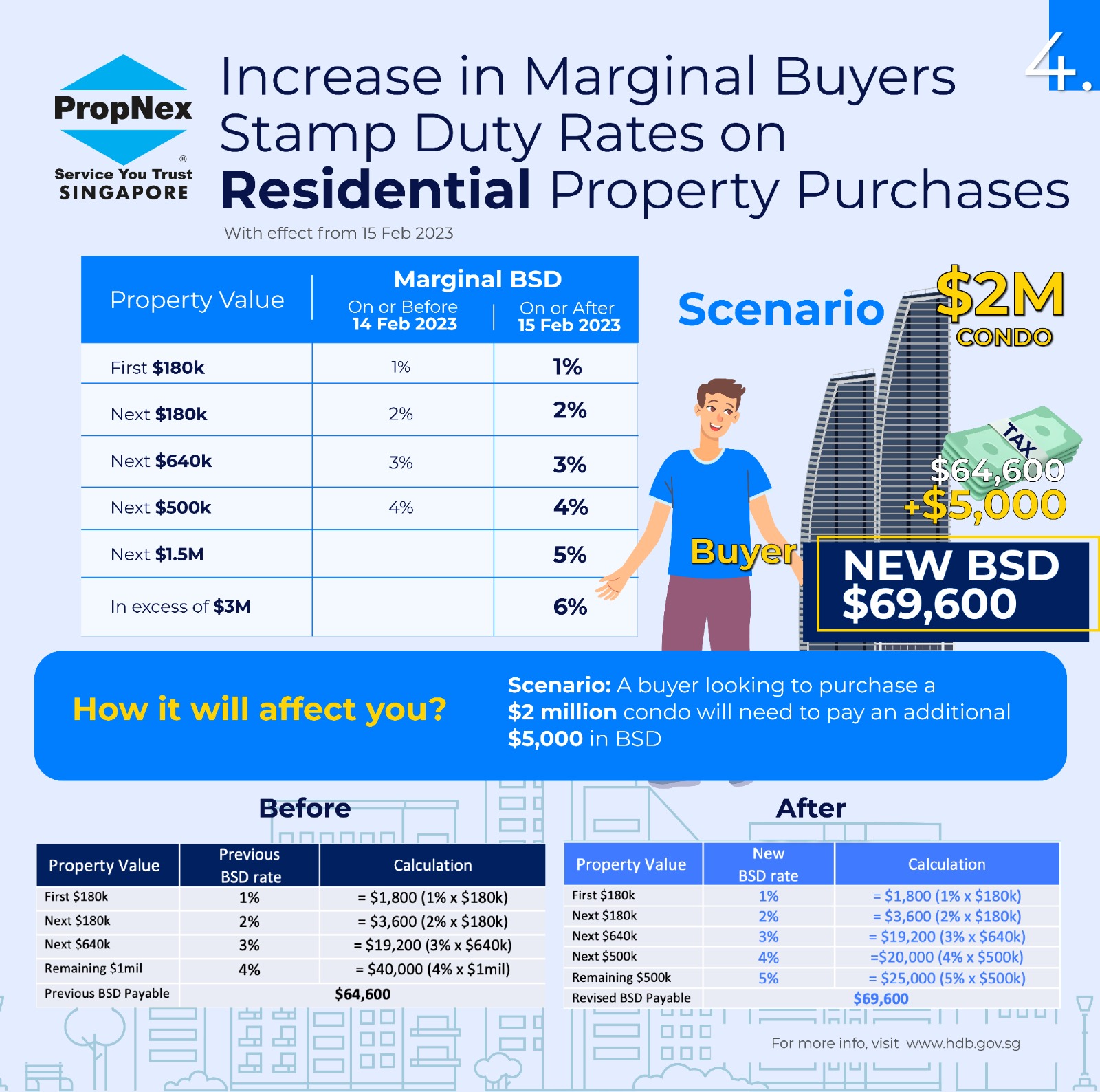 Finance Minister Lawrence Wong announced during Budget 2023 speech on 14/2/2023 that the top marginal Buyer’s Stamp Duty (BSD) rate for residential and non-residential properties will be raised to enhance the progressivity of the BSD regime.